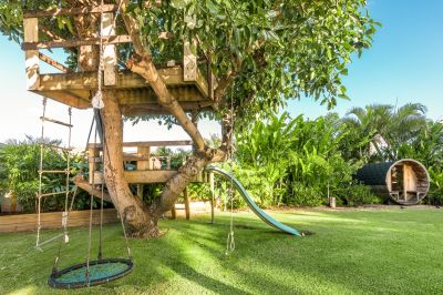 Predominantly set across one level, the home features four generously sized bedrooms, three bathrooms, multiple living zones and a fantastic oversized rumpus/media room. You'll love the open-plan kitchen and dining area, warmed by a cosy fireplace, plus the secondary living flowing seamlessly out to a huge backyard oasis. Outdoors is where this property truly shines. A saltwater pool is framed by established gardens, while a two-storey treehouse is cleverly built into the avocado tree, offering hours of adventure. There's also a chicken coop, a sauna and plenty of room to add anything your family dreams of.