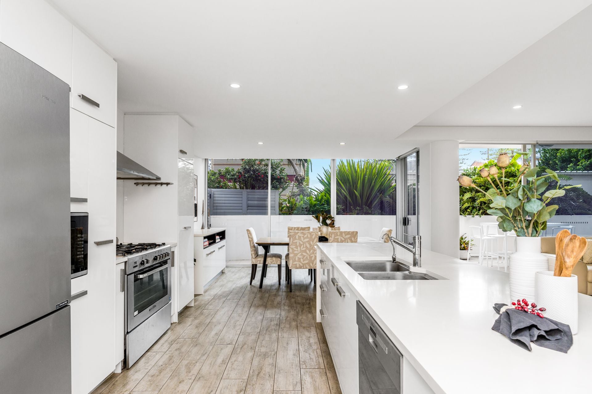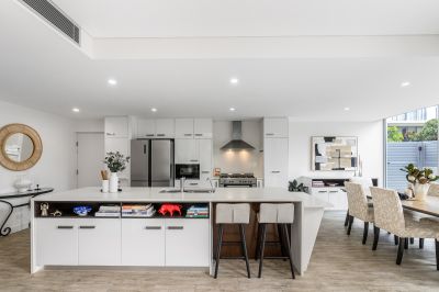 Surrounded by established, low-maintenance gardens, the oversized wrap-around courtyard is perfect for year-round entertaining. Inside, natural light floods the open-plan kitchen, living and dining zones via sliding glass doors.