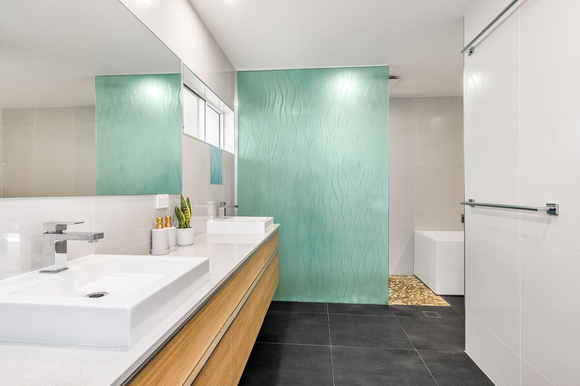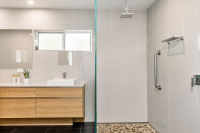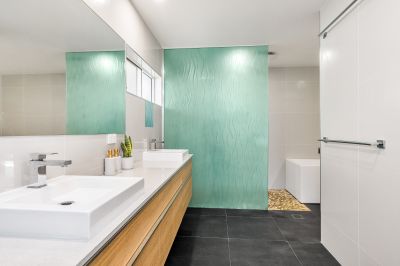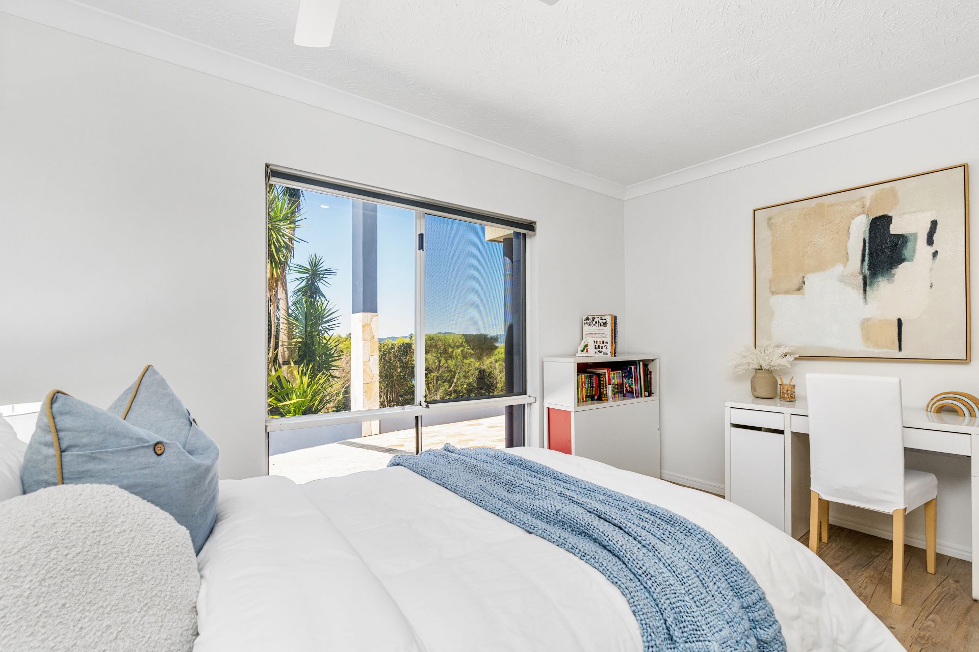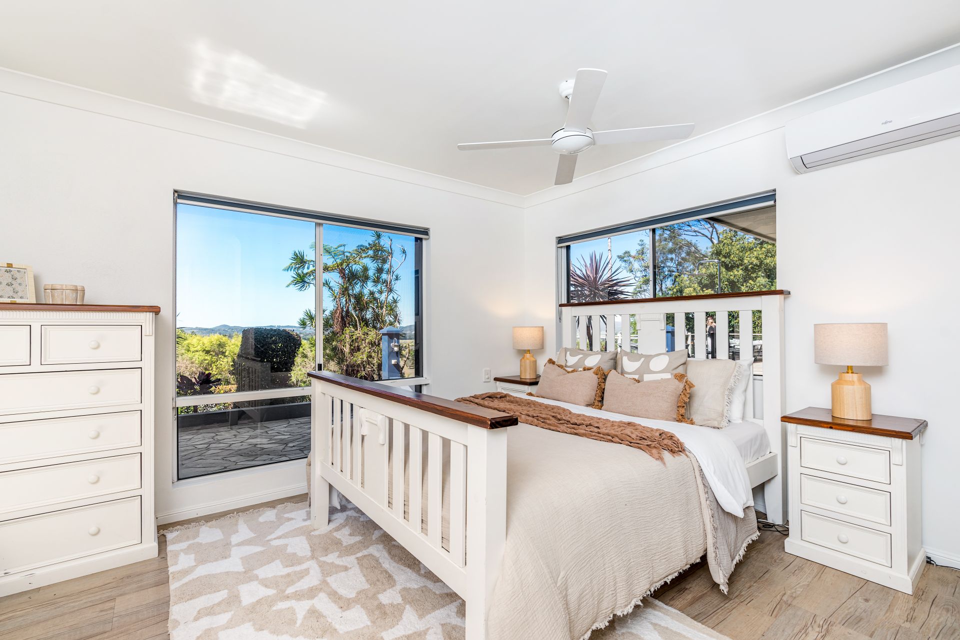 Four well-appointed bedrooms are spread throughout the home, each with air-conditioning, ceiling fans and built-in storage. The master retreat features a generous en-suite with a double vanity, walk-in shower, and bath, while the main bathroom is finished with a timeless colour palette.