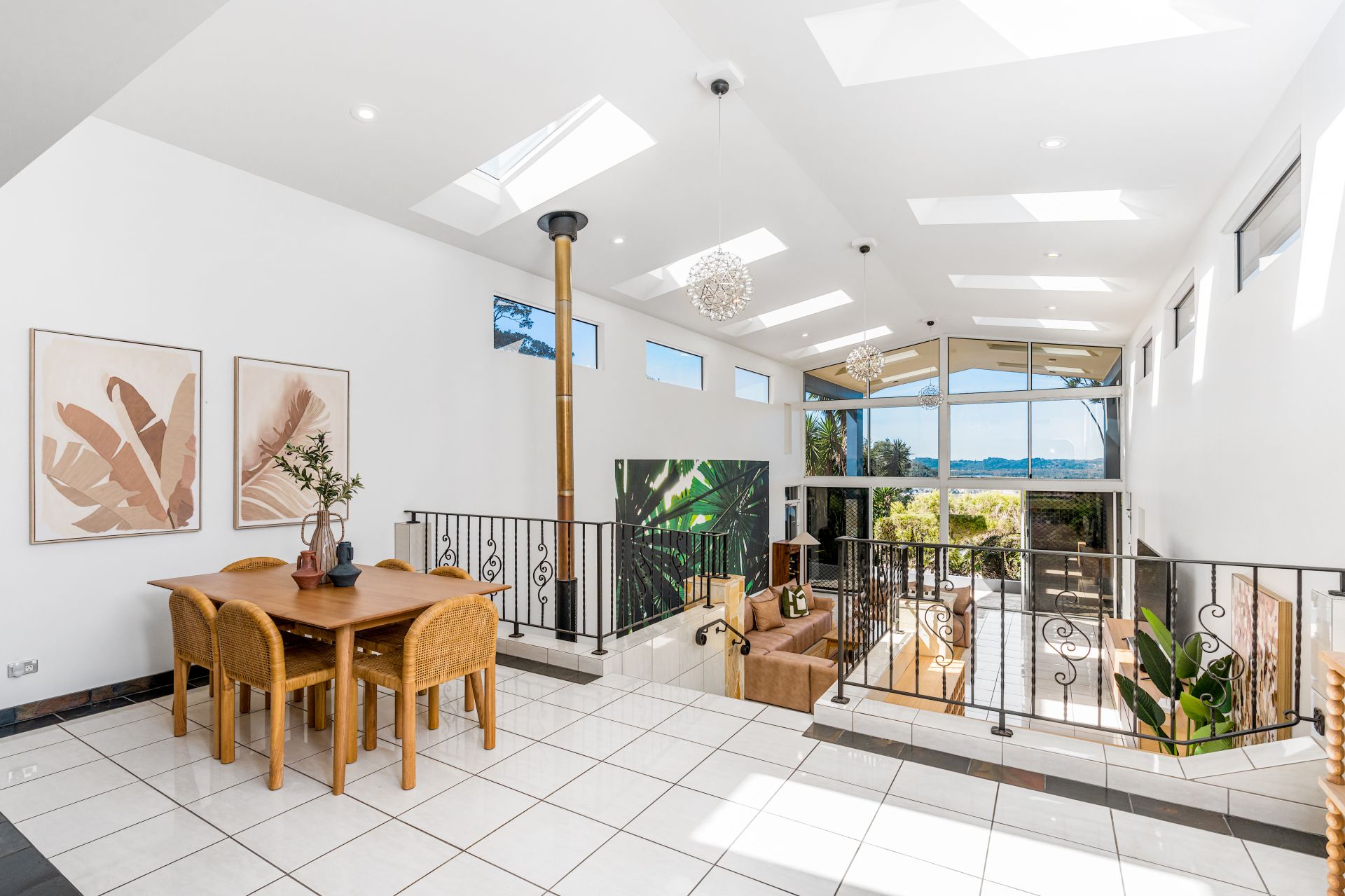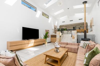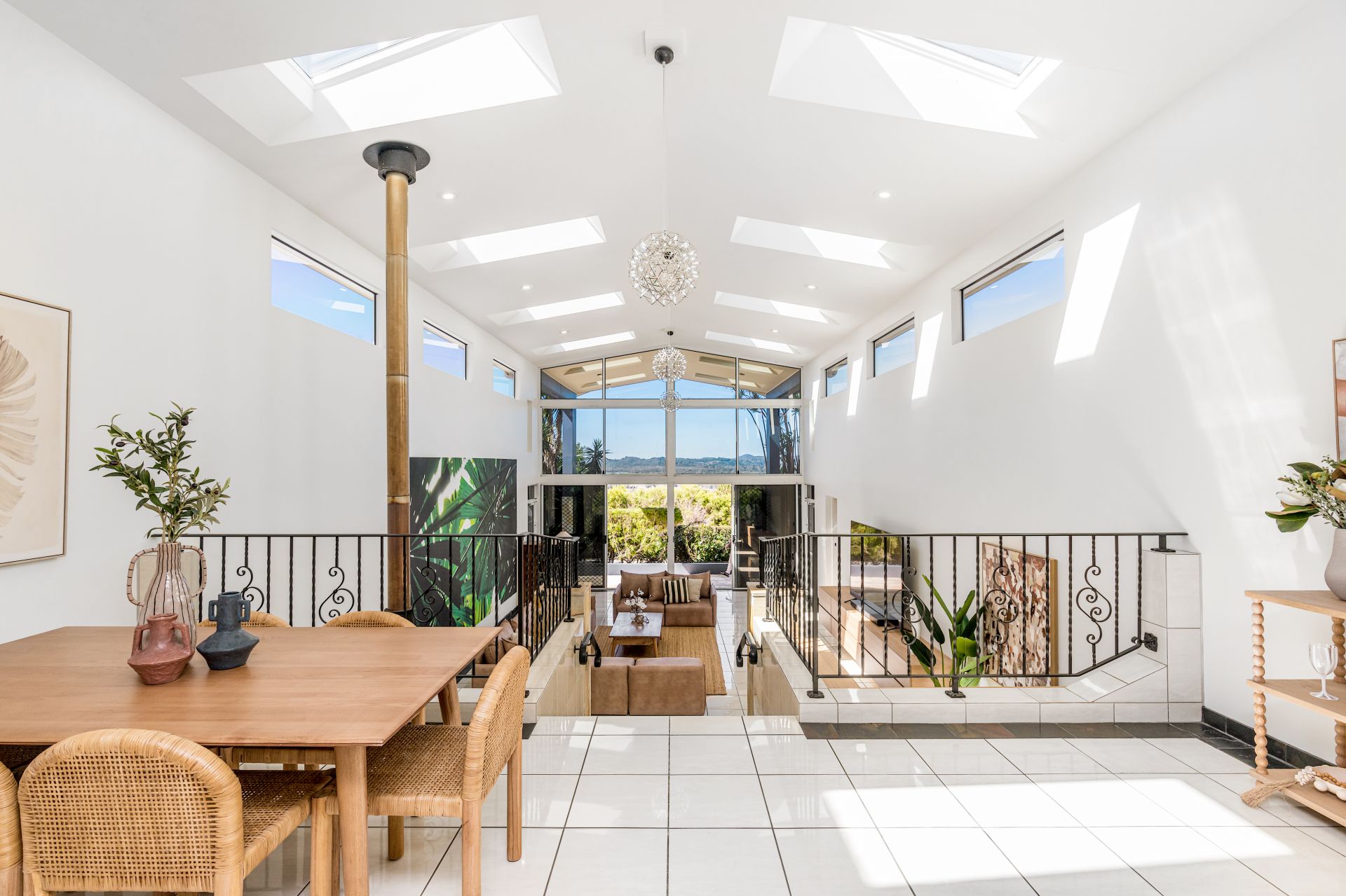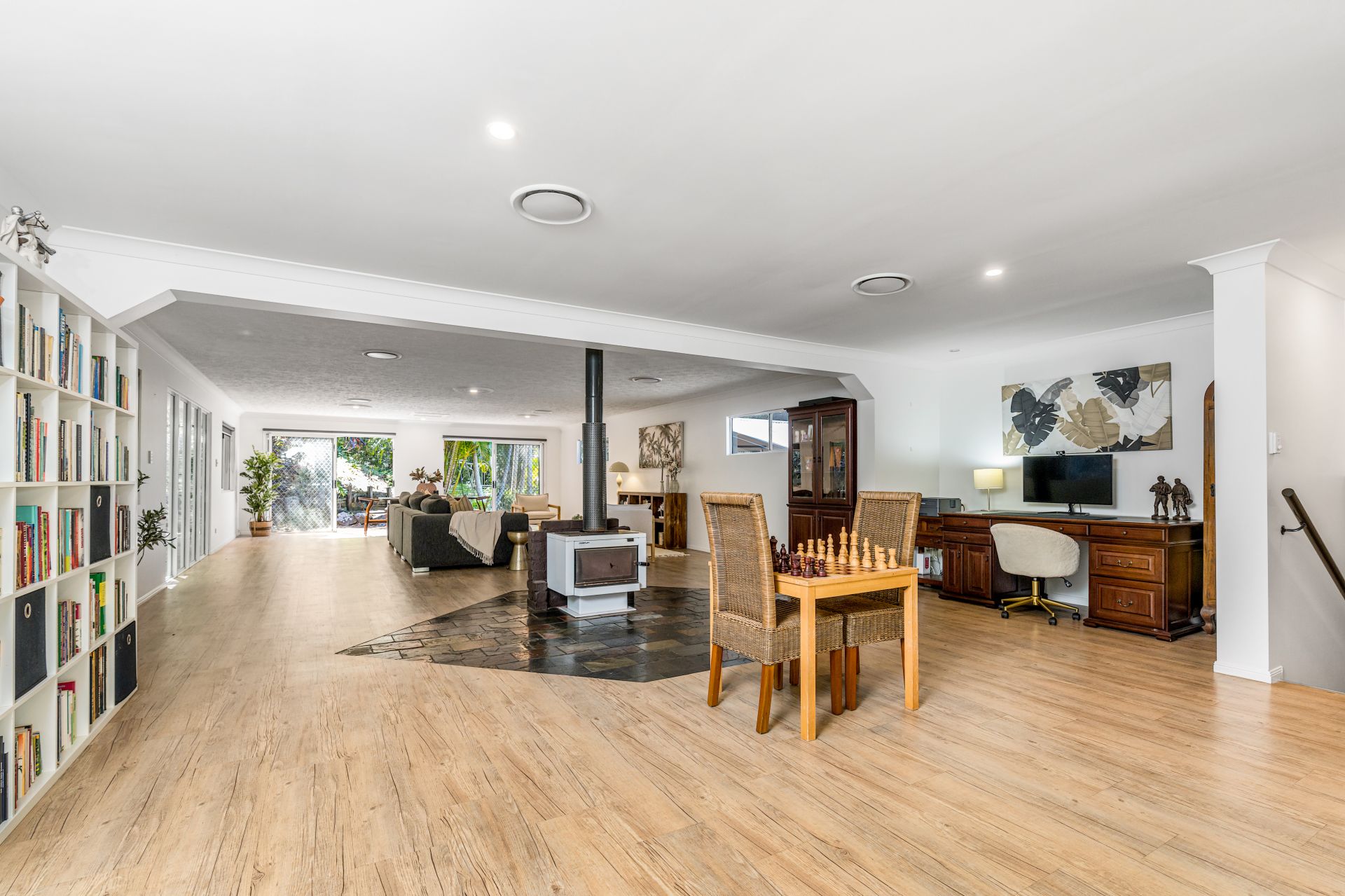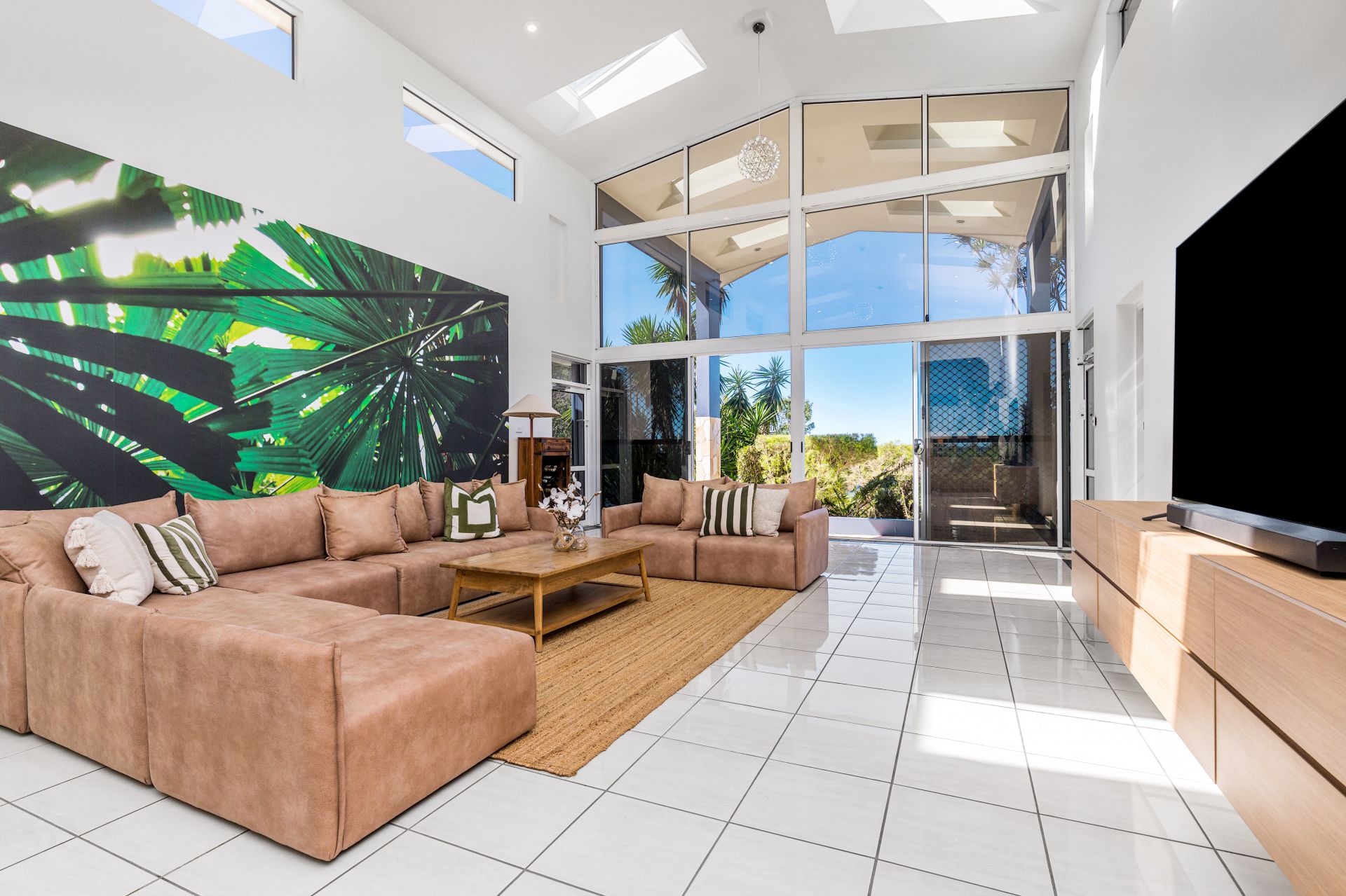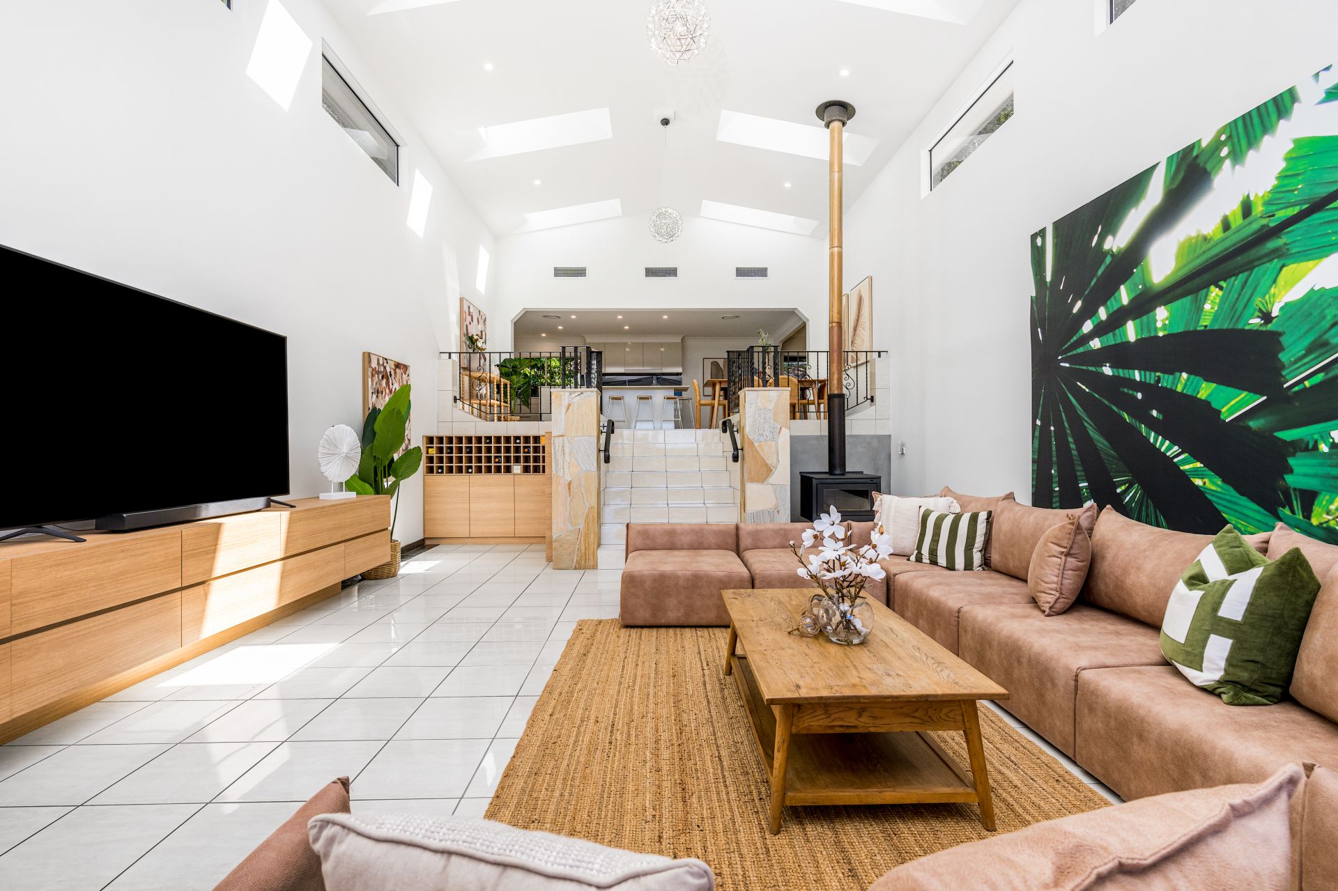 The vast living and lounge zones showcase high ceilings with skylights, vinyl and tiled flooring, and multiple sliding doors that connect seamlessly to the outdoors. A grand staircase, built-in wine storage, a study area, ducted air conditioning, and fireplaces add to the sense of scale and character.