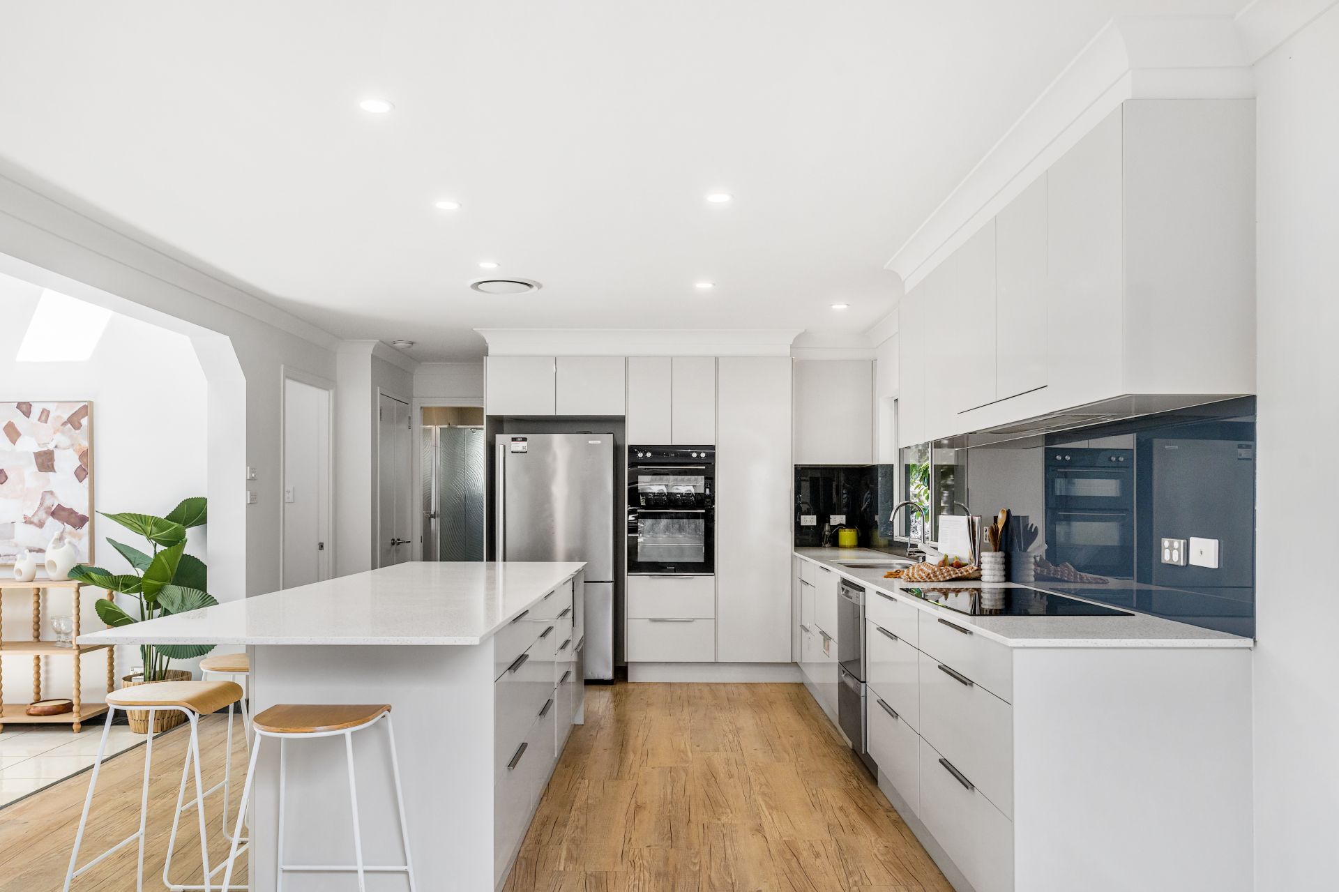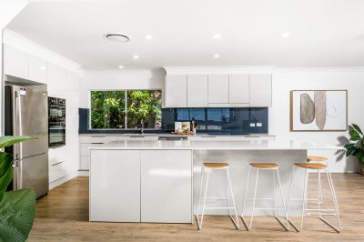 Step through the portico entrance and double sliding doors to discover a sprawling home designed for family living. The open-plan kitchen sits at the heart, featuring a large island bench with white stone tops, a Euromaid double oven, a Westinghouse cooktop, a Fisher & Paykel double-drawer dishwasher, and an abundance of storage.