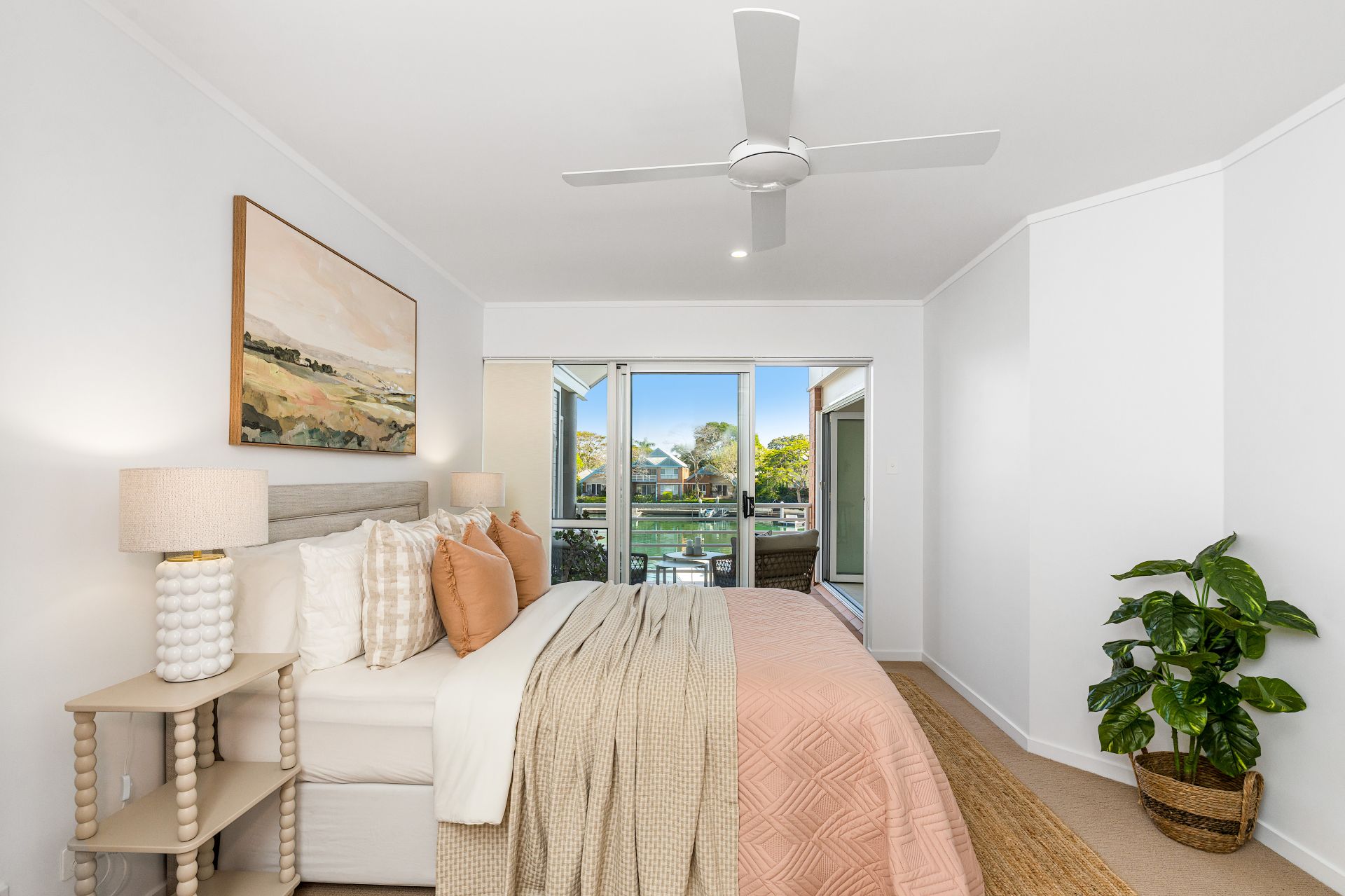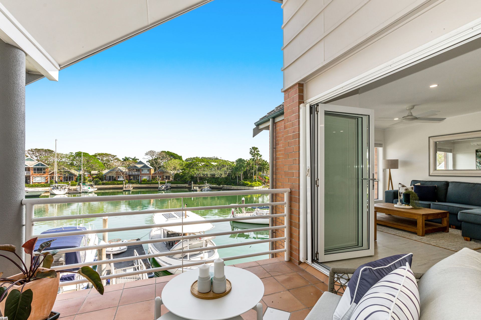 - Bifold glass doors opening to a tiled balcony overlooking the marina.