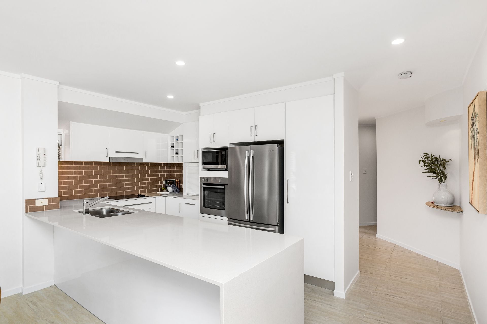 - Stone benchtops, ample storage, Bosch cooktop, Westinghouse oven, Haier dishwasher.