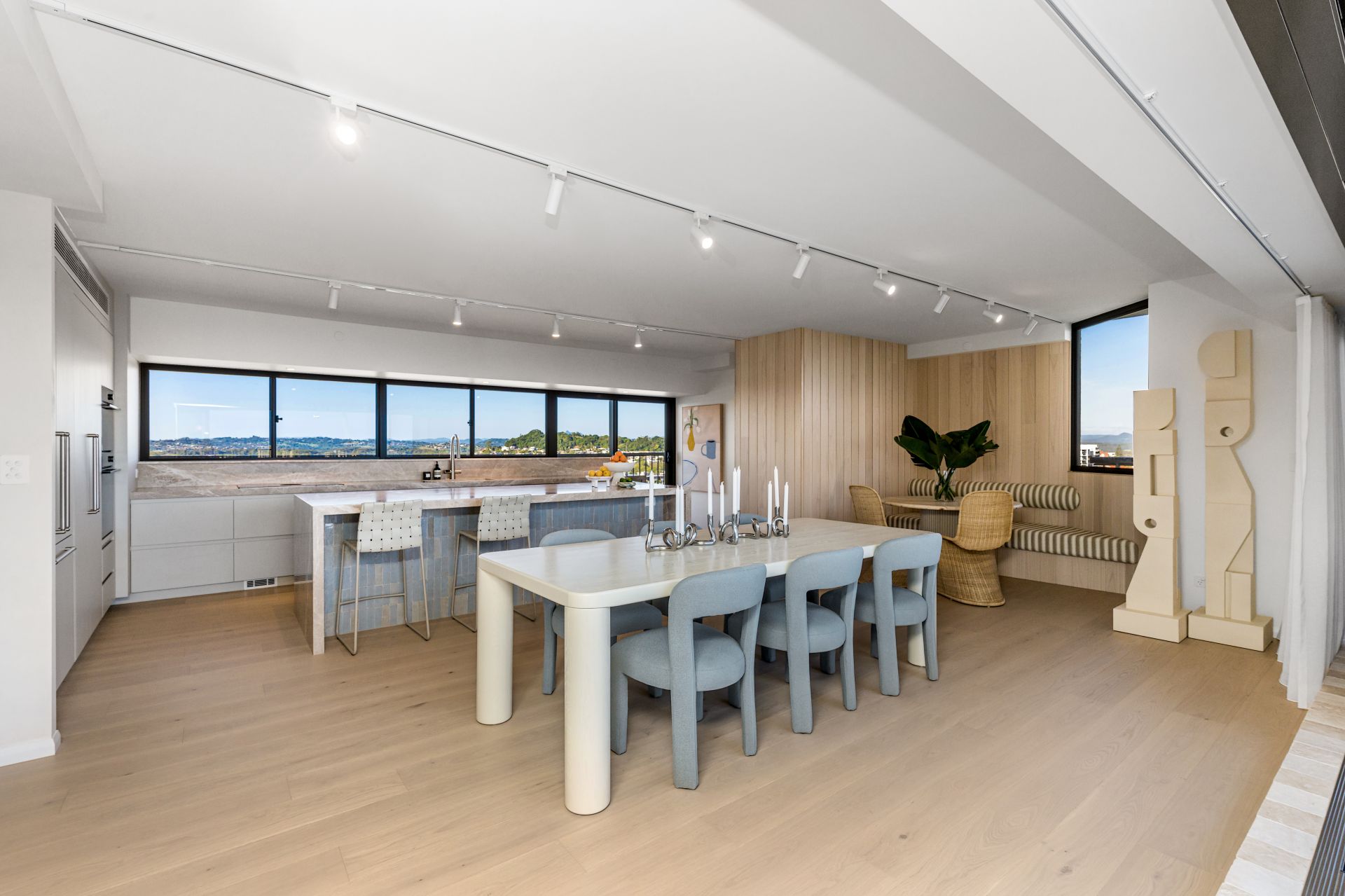 - Two generous dining areas, including a built-in banquette seat, flow to the balcony